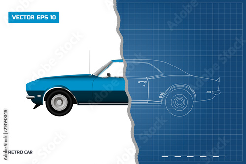 Blueprint Of Retro Car American Vintage Automobile Of 1960s Side