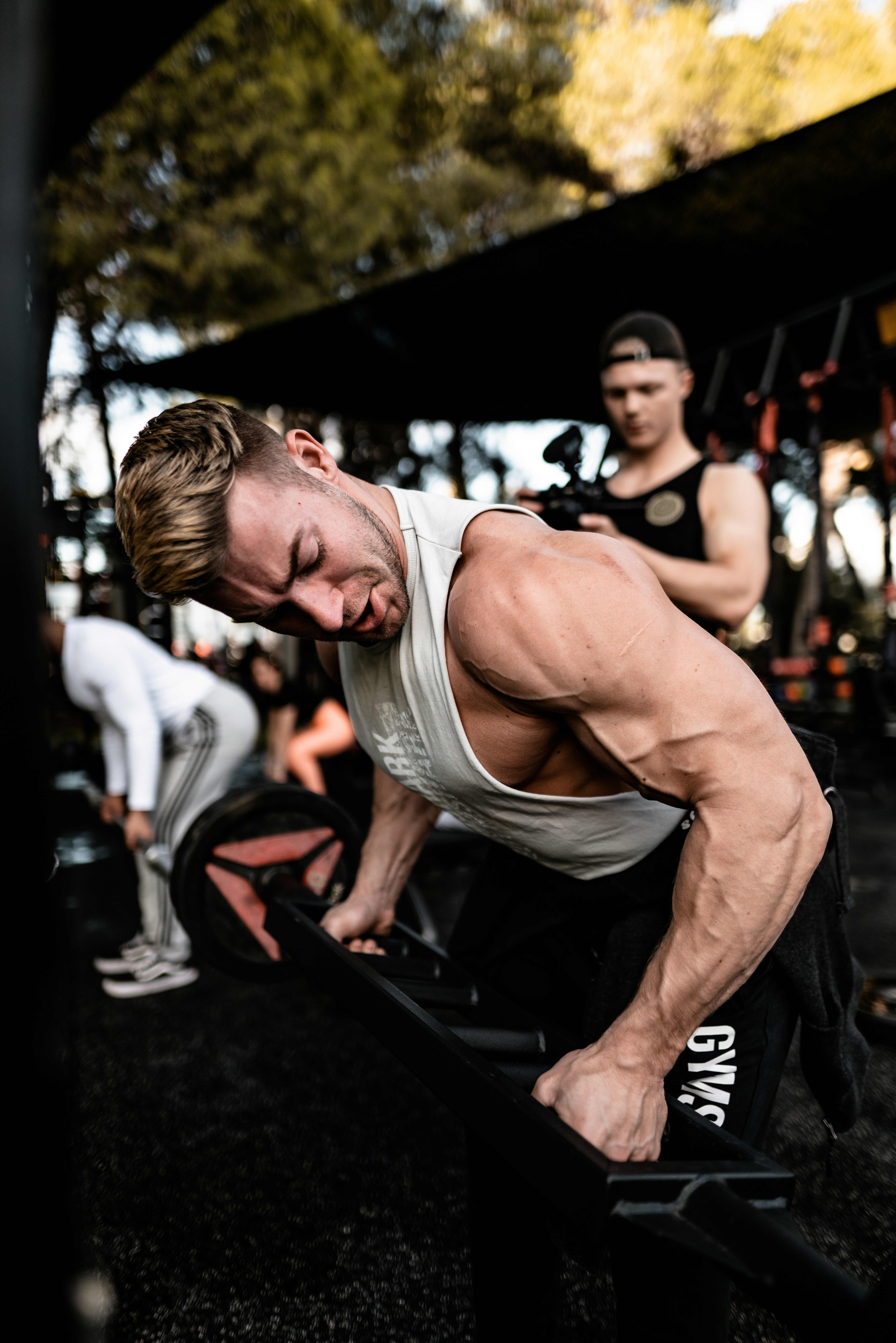 Hot Shirtless Muscular Construction Worker Carrying Big Barrel